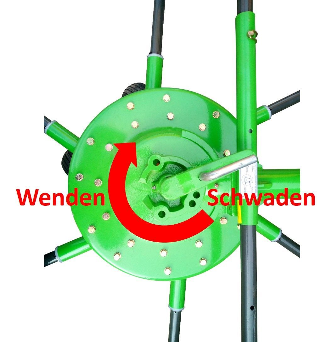 The angular gear of the rotor can be switched from turning to swathing and vice versa using the adjusting lever above the gear. The lever has a locking bolt so that the gear cannot change position during operation